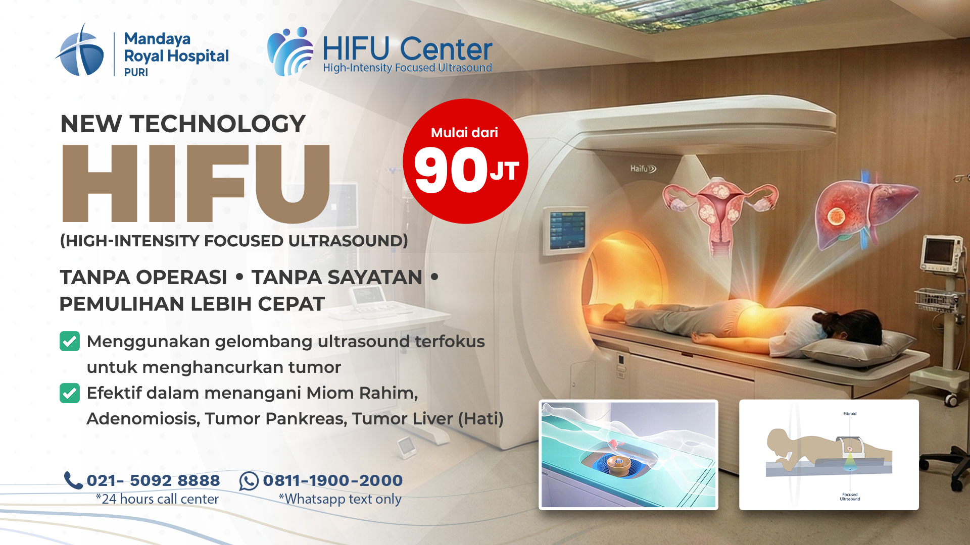 HIFU (High-Intensity Focused Ultrasound) adalah teknologi terapi modern yang bekerja dengan menggunakan gelombang ultrasound berintensitas tinggi yang difokuskan secara presisi ke titik kecil pada jaringan miom atau tumor, cara kerjanya: